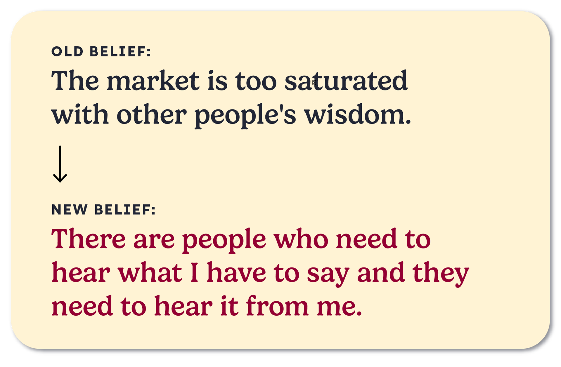 There are people who need to hear what you have to say, and they need to hear it from you. Sure, there are likely thousands of people with your job title. Hell, there are thousands of people with very similar messages to you, but why is it our automatic thought that we have to be the only ones doing something for it to be valuable? Your audience isn't looking for wisdom — yet they’ll be interested in how YOU solve problems and see the world. Your voice is the essential key for those who resonate with you.