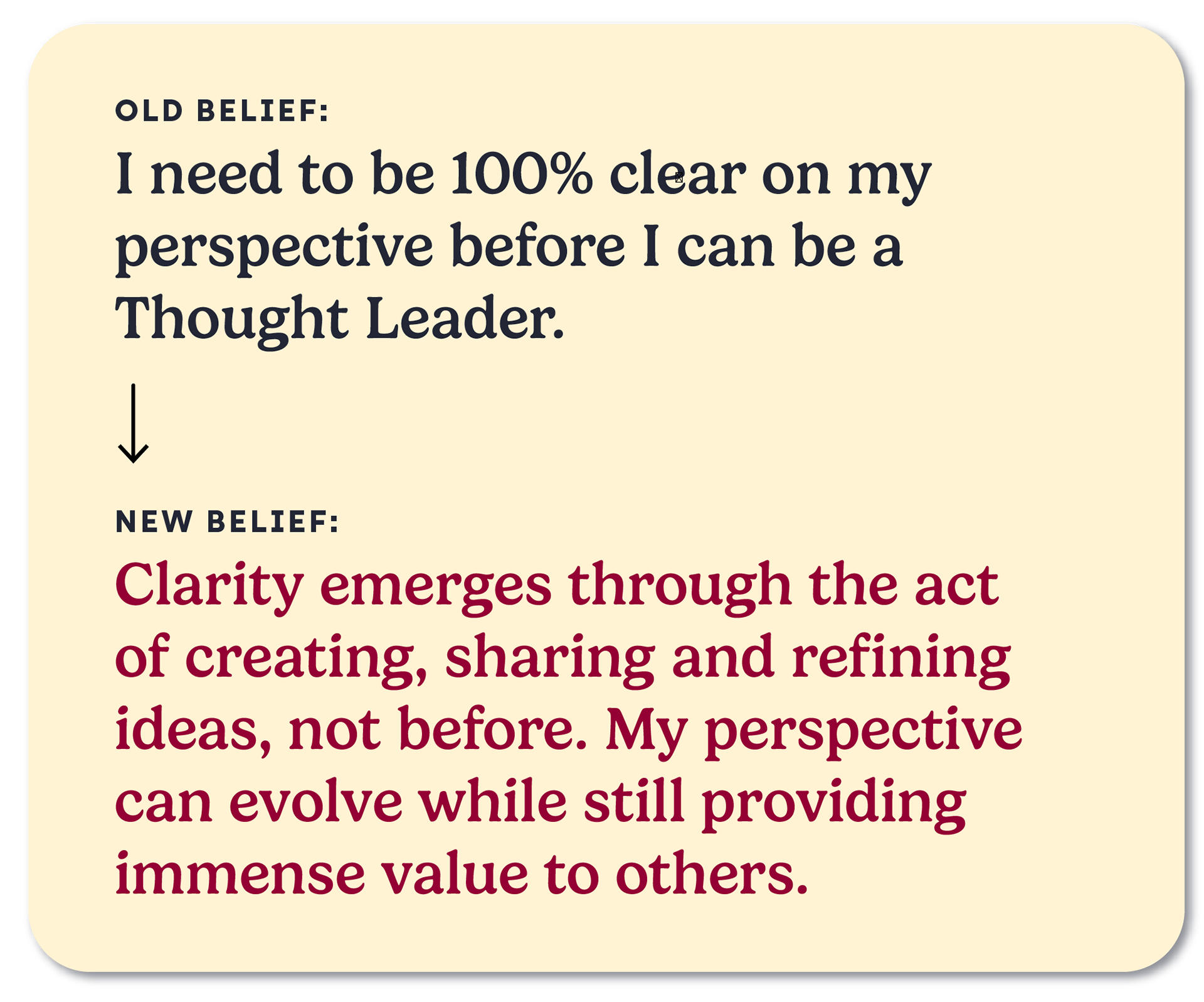Your desire for clarity shows deep reverence for your audience, expertise, and perspective. However, clarity often emerges through the act of creating, sharing and refining ideas, not before. The most impactful Thought Leaders grew their perspective by engaging with their audience, not by waiting for perfect clarity. Your perspective can evolve while still providing immense value to others. Remember, there is no one else who has your combination of experiences, skills, and expertise. You’re perspective is valuable even if it’s still developing and changing — if it weren’t, would you really be that trustworthy?