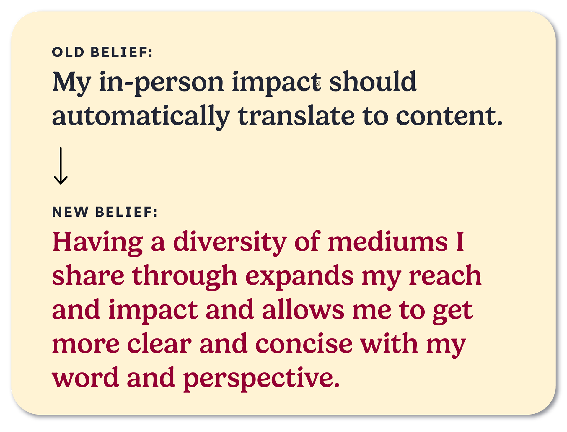 However, different mediums require different approaches to convey the same power. You could see this as a frustrating blocker or a creative opportunity. Having a diversity of mediums you share through expands your reach and impact, and forces you to get more clear and concise with your words. With the right strategy and support, your content can be just as impactful as your in-person presence.