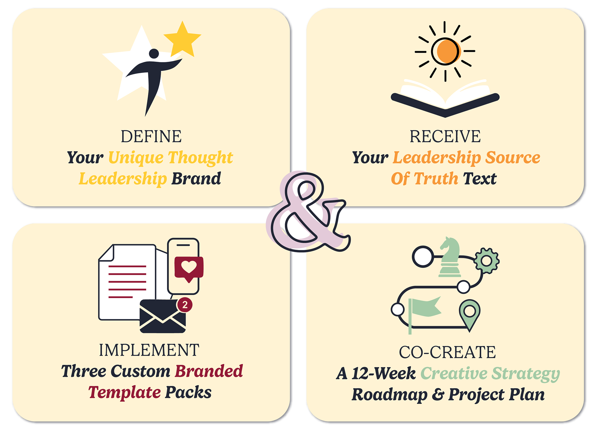 Define your Unique Thought Leadership Brand that will serve as your Leadership Source of Truth — The source text you can refer back to when business and leadership inevitably feel hard. Together we’ll uncover your: