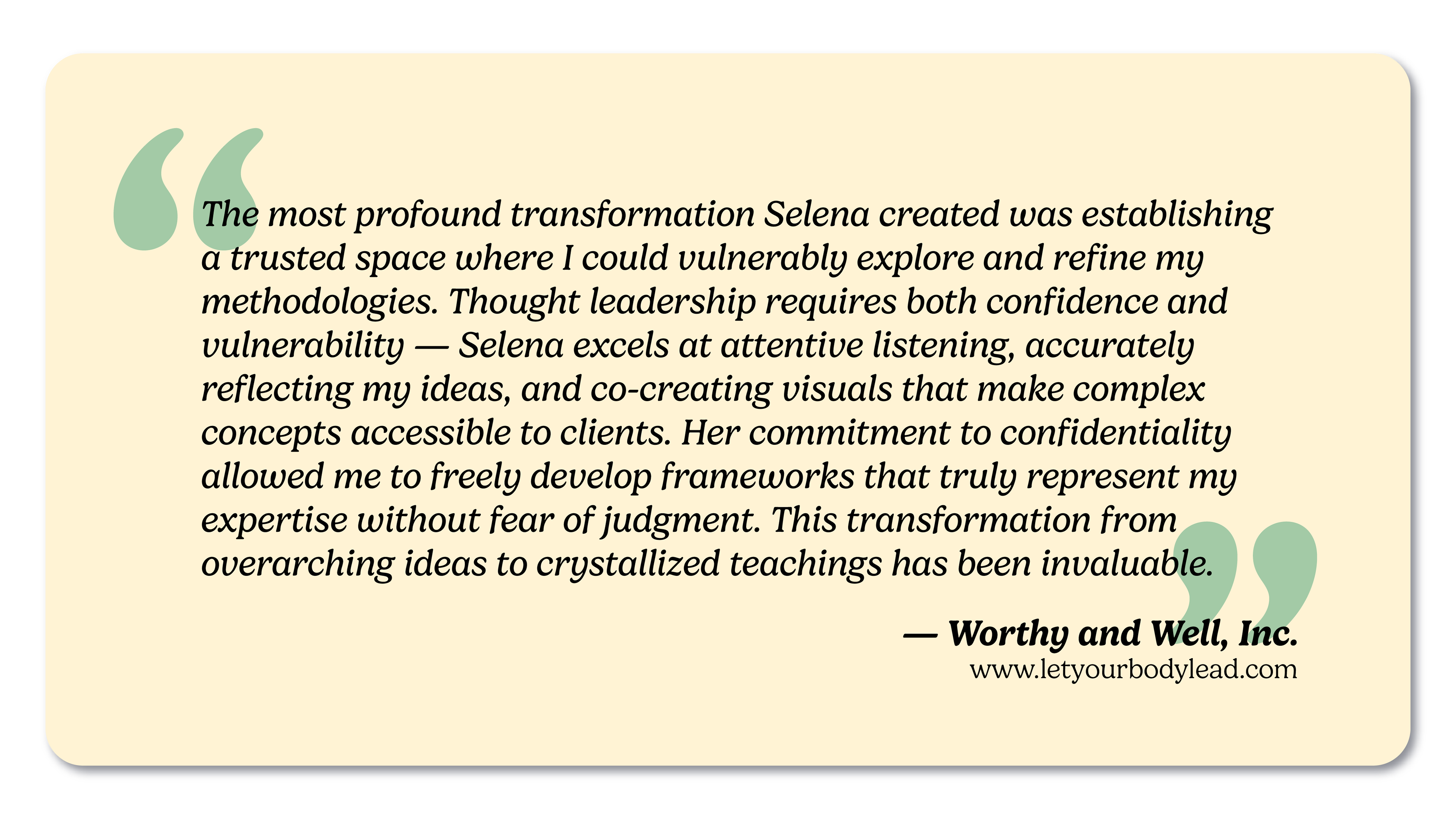 As a multidimensional and multi-passionate creative — with big ideas myself— I often think, “Damn I need a Selena to listen, reflect back, hold space for, and translate my ideas.” With a purpose statement like, “I am here to create resonance,” you know I will ask questions until I uncover the truth behind your message; And of course, creating resonance goes both ways, first within you, then in helping you resonate with your clients.